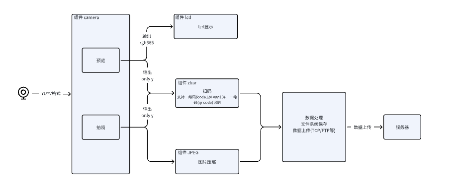 本文档旨在详细说明模组外接camera 的硬件连接、软件接口及使用的注意事项。功能覆盖拍照/预览/图片压缩/扫码/数据存储/数据传输等场景,如智能扫码设备、智能水表/电表/气表等